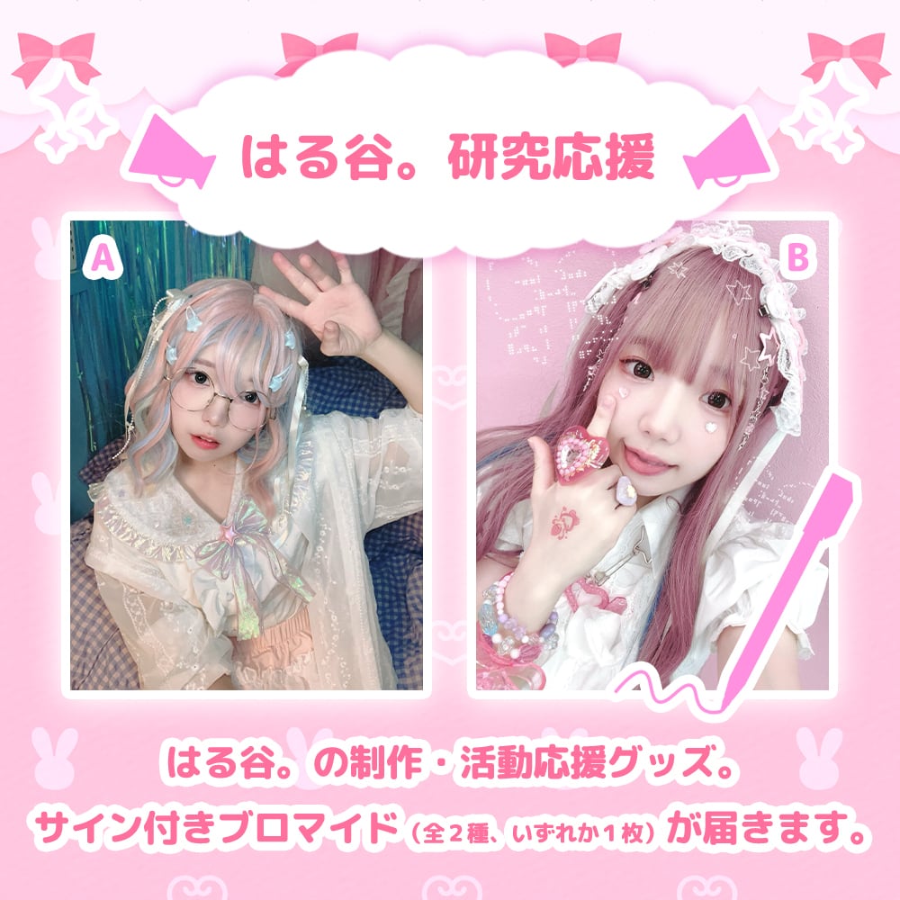 はる谷。の制作・活動応援グッズ。 サイン付きブロマイド(全2種、いずれか1枚)が届きます。 ※2個購入の場合は2種とも封入 グッズ制作や作品制作に役立てます。 応援してくれたら嬉しい!!